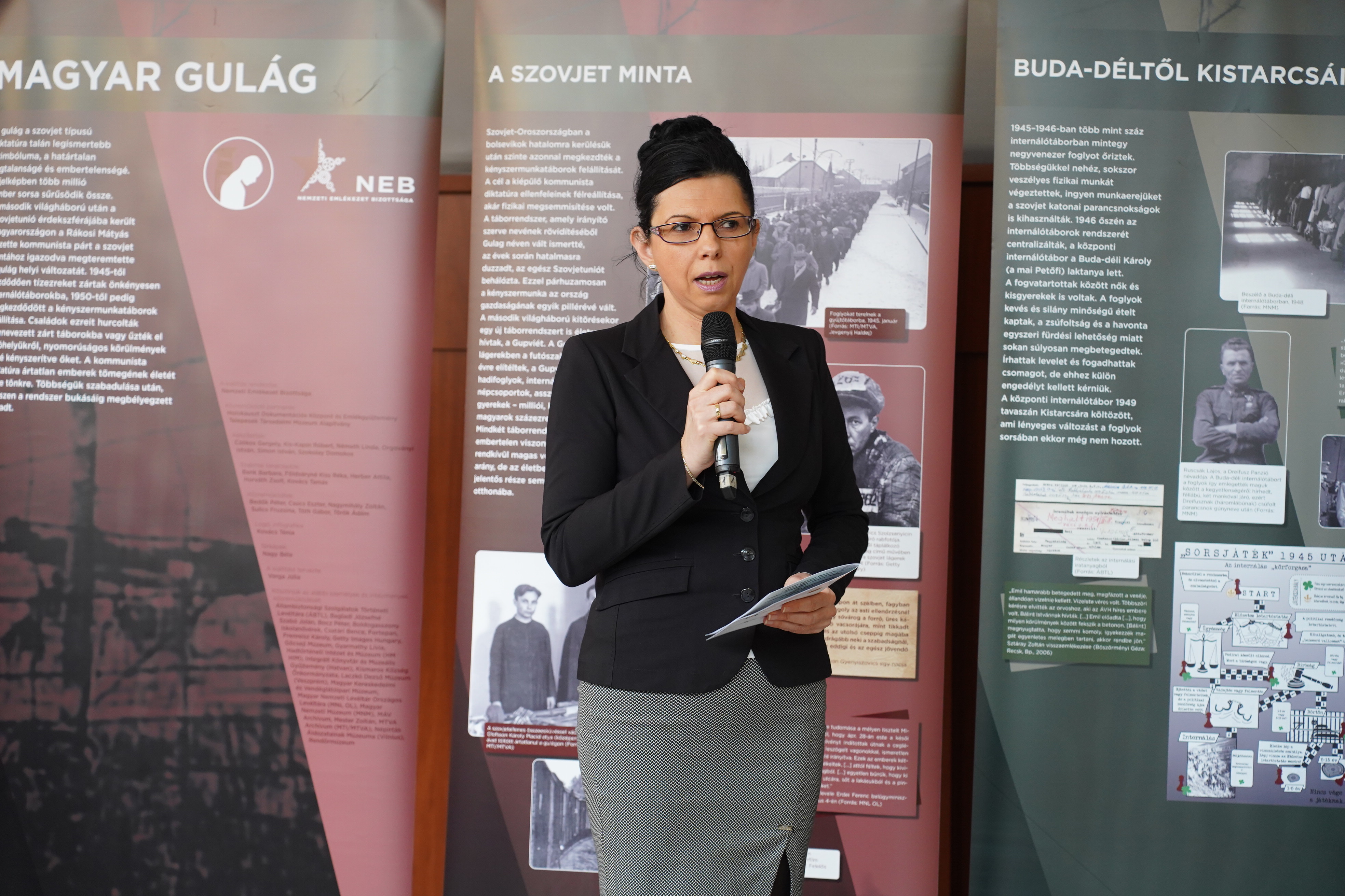 A D épület Kerengőjében berendezett tablókiállításon dr. habil. Zsoldos Ildikó, a Történettudományi és Filozófia Intézet igazgatója köszöntötte a megjelenteket. Hangsúlyozta: a tárlat a TFI tudomány ünnepi rendezvénysorozatának második, egyben záróprogramja. A megnyitó időpontja – mint mondta – tudatos választás volt, november 25-e ugyanis 2012 óta a Szovjetunióba kényszermunkára elhurcolt magyarok emléknapja. Az intézetigazgató kiemelte: a kiállítás a szovjet mintára létrehozott hazai internáló- és kényszermunkatáborok rendszerét mutatja be. 1945-től előbb az internálás vált „rendszeresített” eszközzé, majd 1950-től a már nyíltan működtetett munkatáborok következtek. Mint fogalmazott: a diktatúra eszköztára kíméletlen volt, és sorsok százezreibe avatkozott bele, ezért is fontos, hogy a mai hallgatók szembesüljenek ezzel a múlttal.